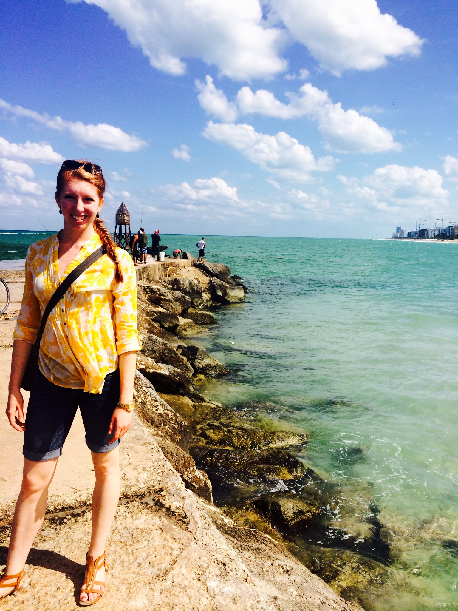 This past Saturday, I joined 4 of my cast mates for dinner at TGI Friday’s.  I’m not a huge fan of the food there, but the company was great.  I spent most of the meal laughing!  After dinner, we met up with a few more cast members at the apartments.  Although this cast is large, I’m gradually getting to know everyone.  It had been a long week, so I faded pretty early.  The next day, my roommate and I went to Surfside for brunch at a small cafe.  We stopped in a little boutique, had some non-dairy ice cream at a yogurt shop, and then walked to the beach.  I had no desire to wear a bathing suit, but loved having my feet in the sand!  We walked and talked while wading in the water, and found ourselves stuck behind a row of condos at Bal Harbour.  Before we made it back to the street, we came to a dock with incredible views.  What was originally supposed to be just brunch became a beautiful day outside!