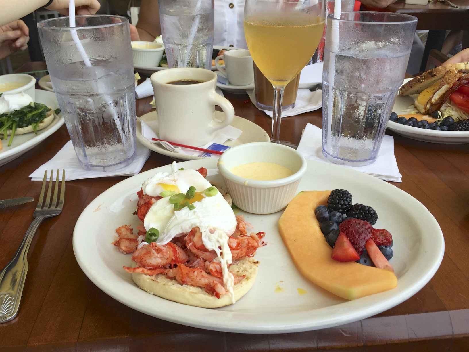 My latest brunch adventure was at Coconuts. We had an outdoor table of 4 overlooking a marina. The setting was lovely, but the food was even better! The table was given complimentary mini donuts with a coffee glaze. I started with a coffee and a bellini. My main course, lobster eggs benedict (are you noticing a theme?), was incredible. Since we were still enjoying our location, the wait staff, and the food, we ended up sharing an order of the special French toast of the day. It was stuffed with marshmallow fluff and chocolate, coated with Corn Flakes, fried, and topped with powdered sugar and more chocolate. I couldn’t have had more than a few bites, but it was amazing.