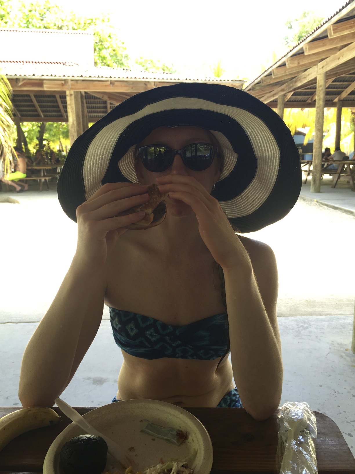 I spent the next few hours in and out of the water. When I got hungry, I ate a burger at the nearby buffet, even though that was the last thing I should have eaten in a bikini! After another dip in the ocean, I played with some friends with a ball and paddle. My hand-eye coordination was pretty terrible, but it was fun to play a game.