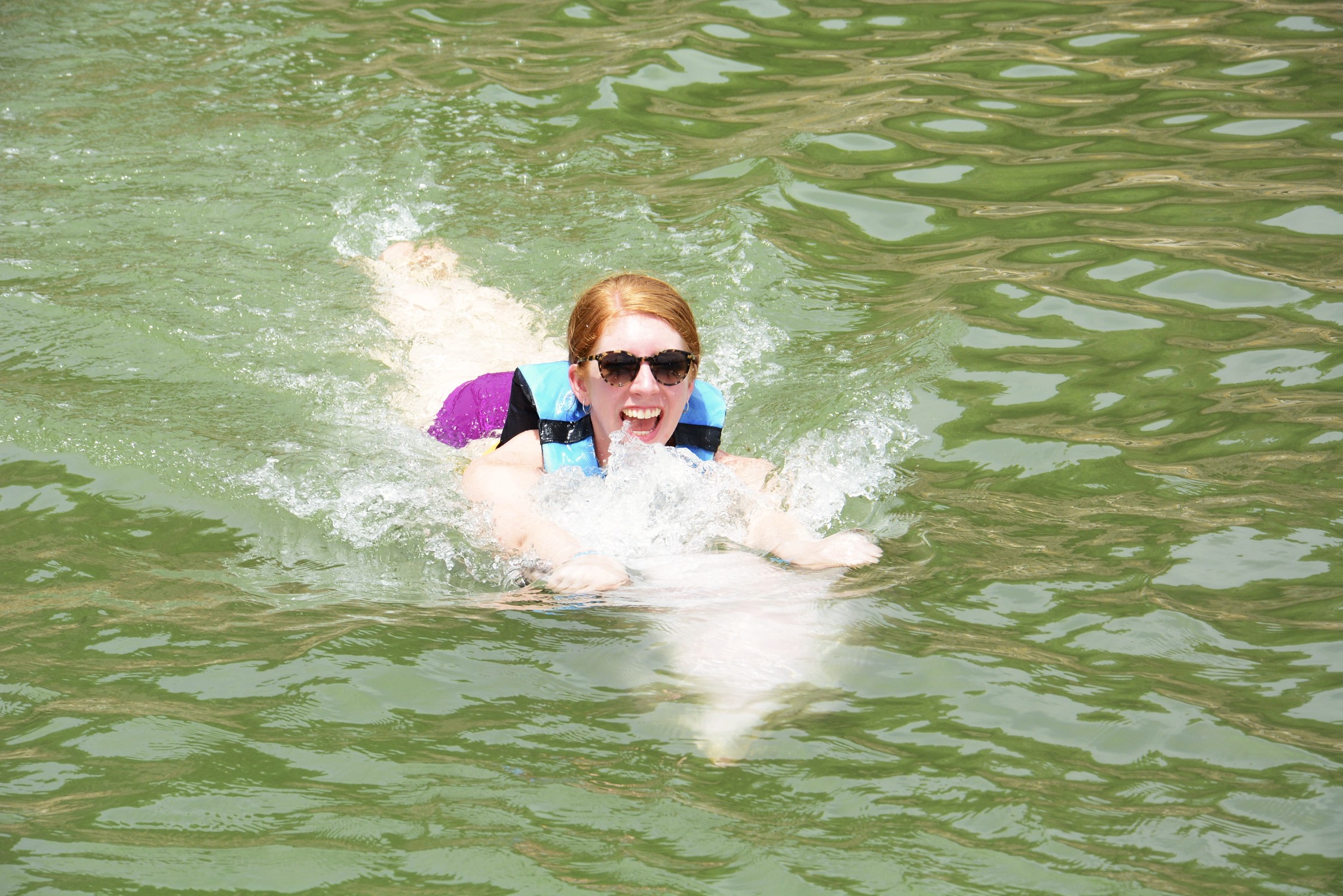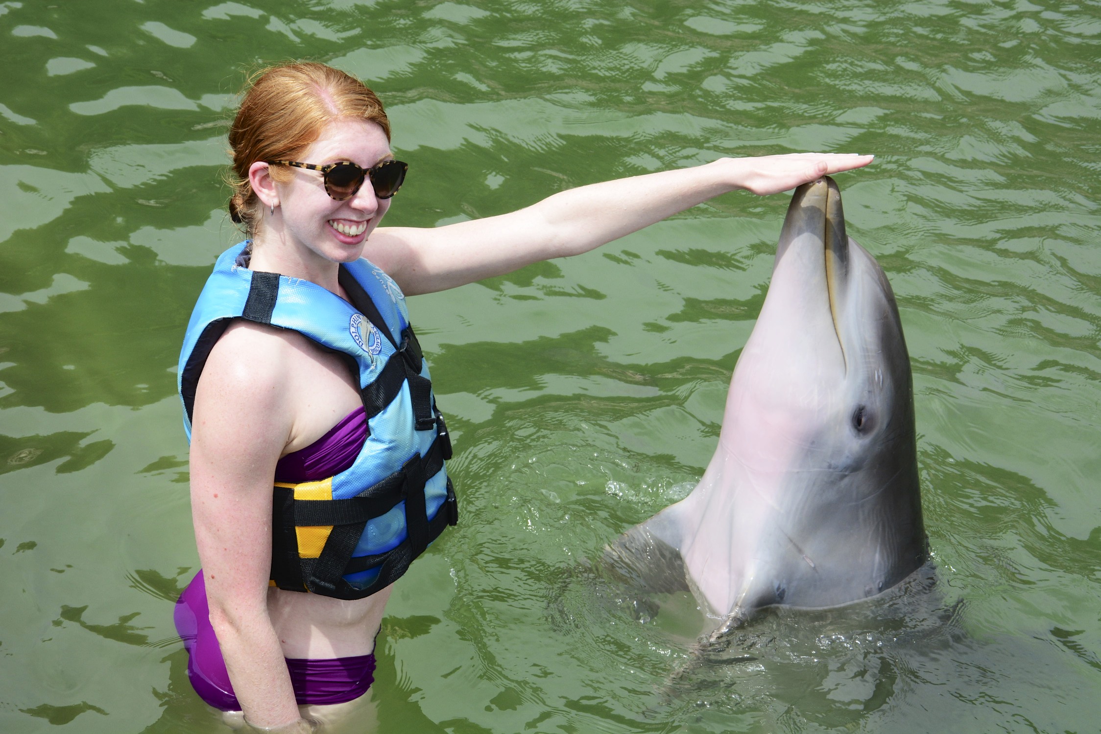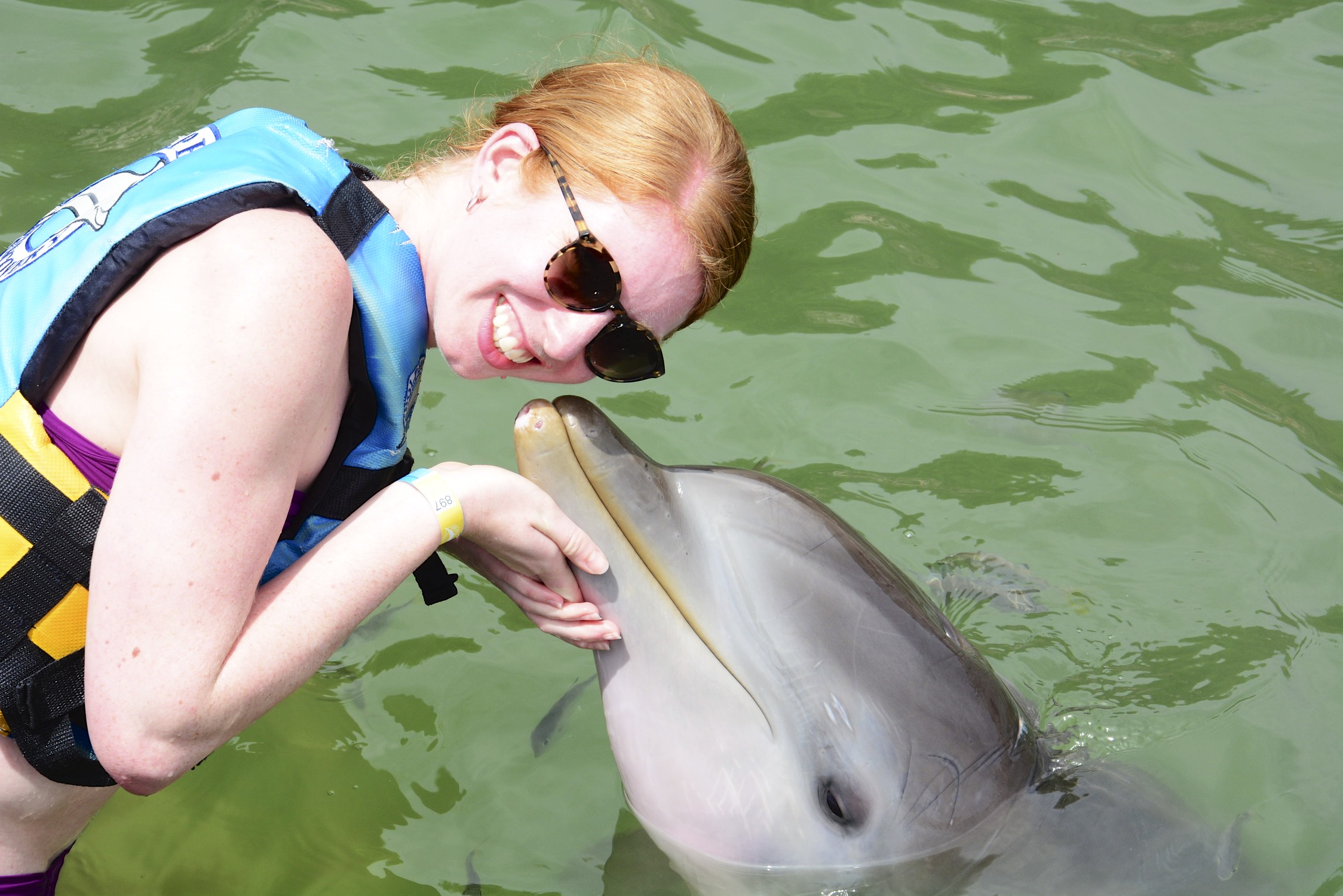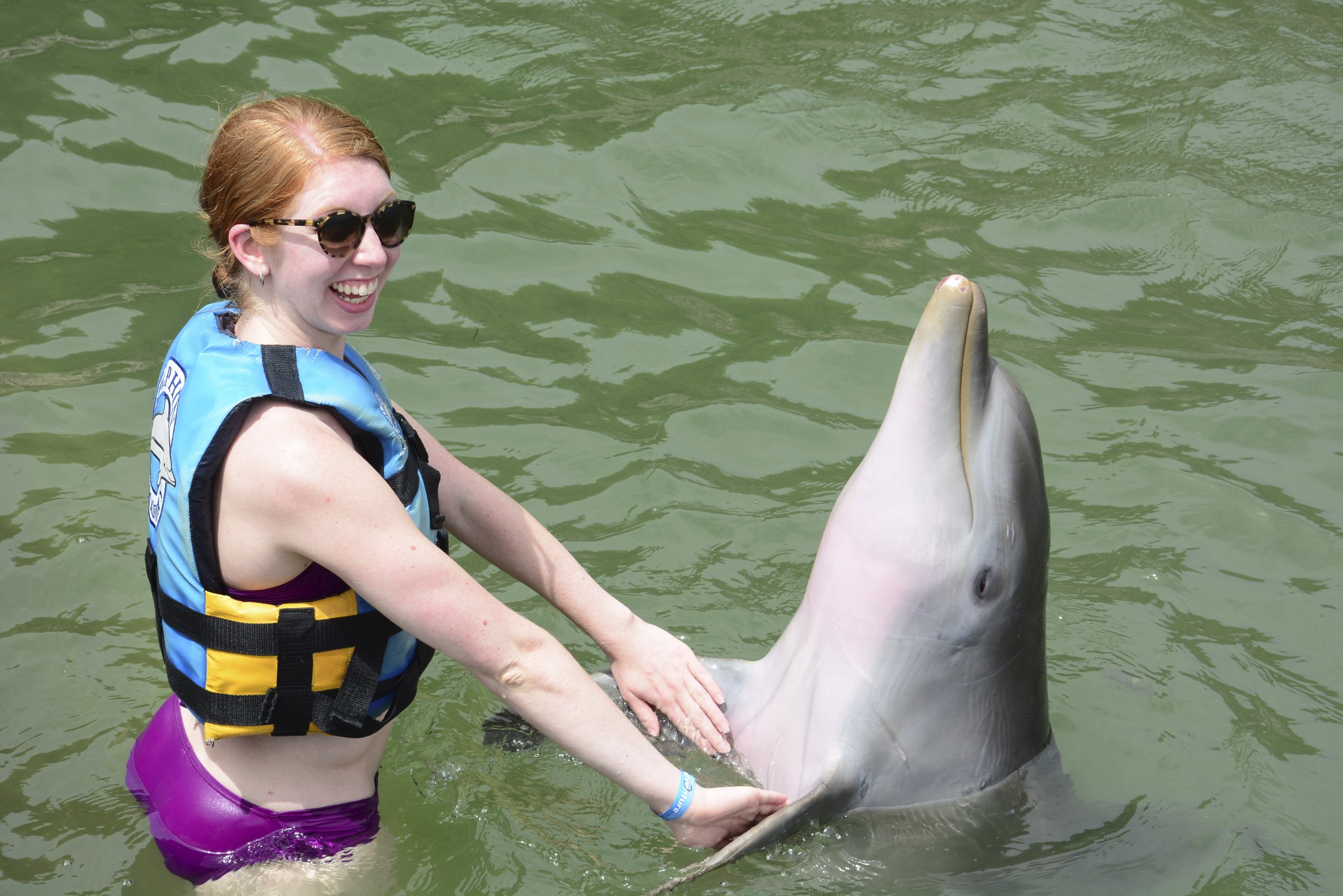 Each person in the group was able to rub the inside of Dante’s fins, kiss his nose, receive a kiss on the cheek, and hold out a hand for him to bump. We were also able to swim out in the water, and Dante would come up behind one person, swim on his back, and allow the person to grab his fins and he pulled us through the water. I didn’t just swim with a dolphin; I swam on a dolphin! For the last activity, we swam out on a boogie board, held our legs out straight behind us, and Dante pushed one foot with his nose, driving us forward. He was very strong, and pushed very quickly!