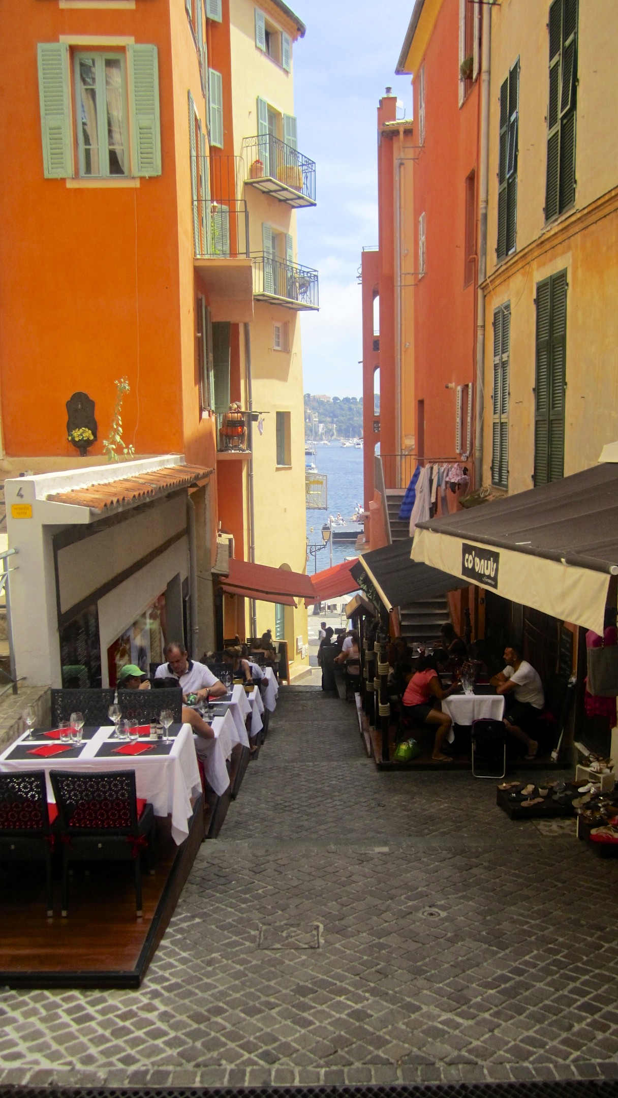 We stopped in Villefranche, a small town between Nice and Monte Carlo on a perfect, sunny day. I got off the ship with a fellow dancer, hoping to find food and wine. We took a tender boat from the ship to the terminal. During the boat ride, I enjoyed some fantastic views and a nice, light breeze.