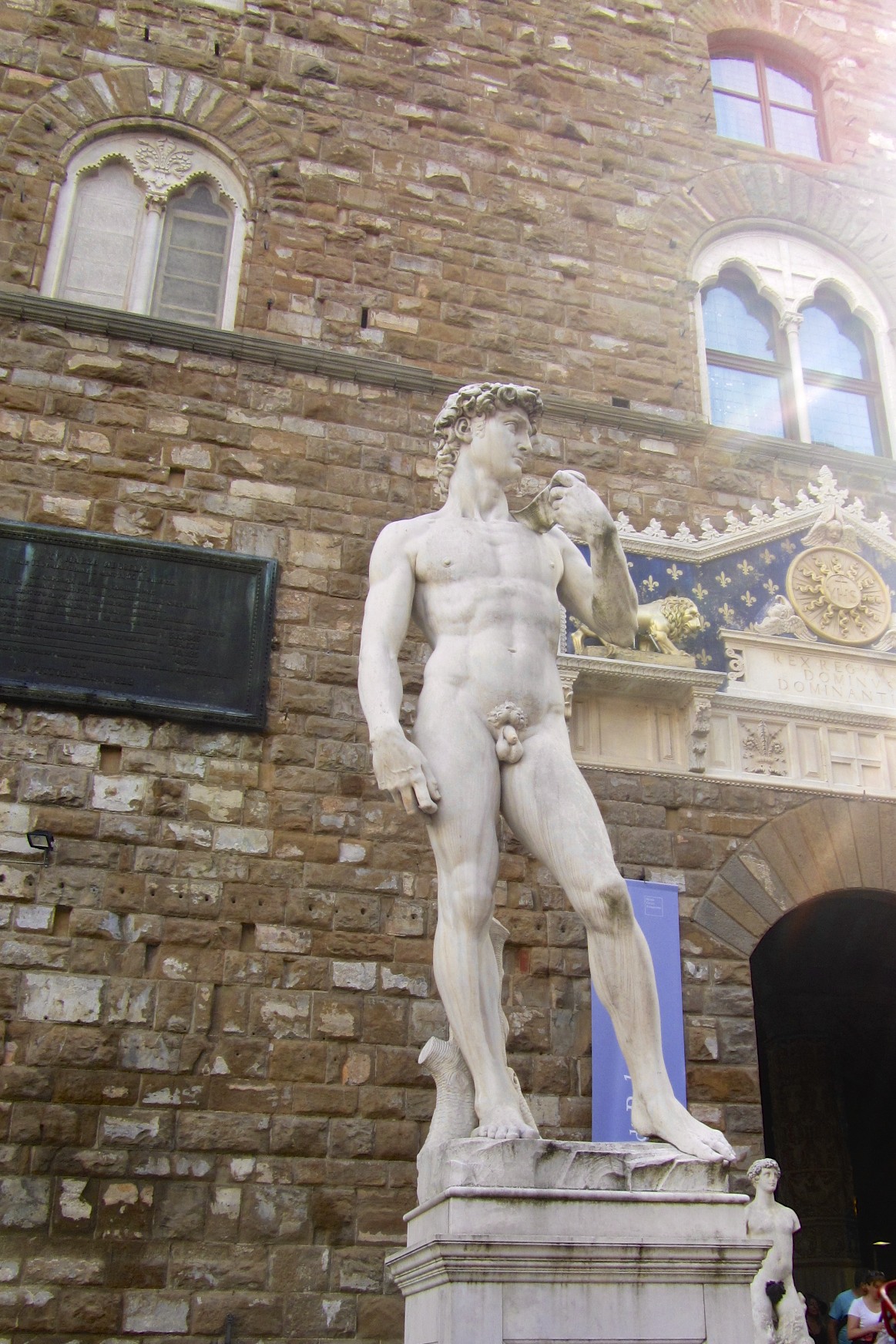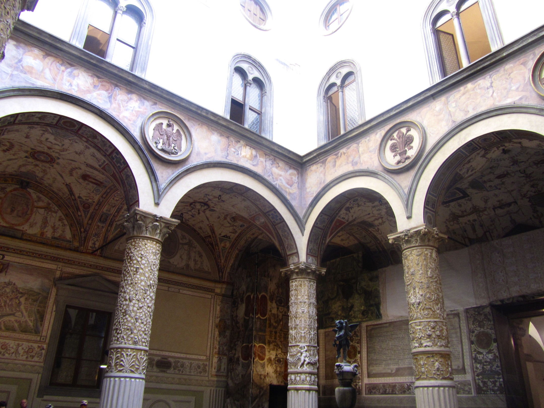 From there, we walked down Via Calzaioli to Piazza Signoria to see the imitation statue of Michelangelo’s “David”. The original statue is across the city at the Academia, but photos are prohibited. We then walked through the cortile, or internal courtyard, of the Uffizi Gallery, a structure originally built for Cosimo de Medici as the offies for Florentine magistrates.