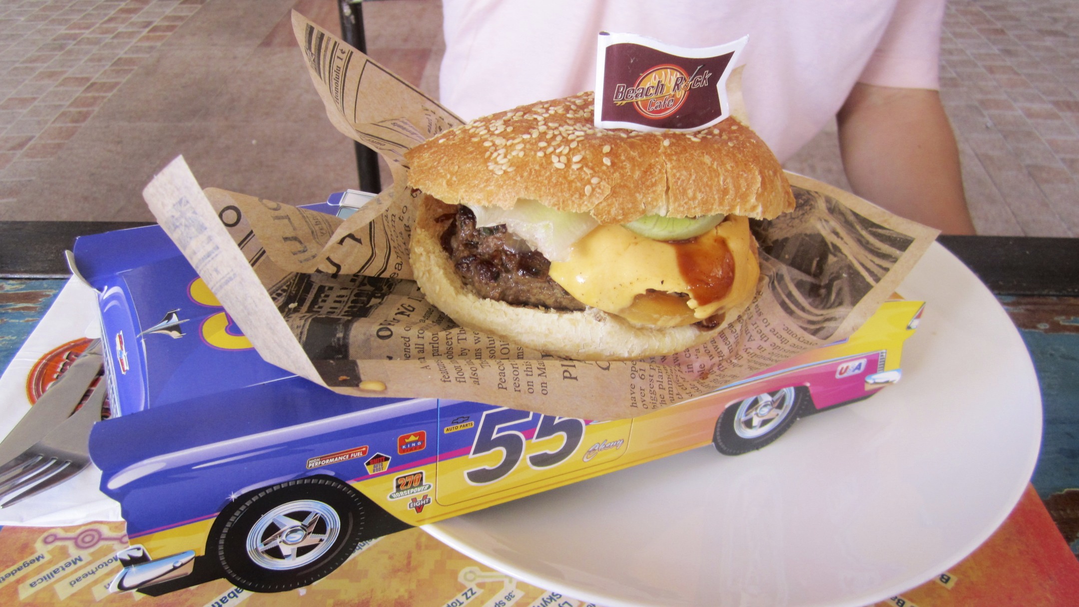 When we got off the bus, our first priority was food. There had been a party the night before, so we wanted greasy food. Right across from the beach, we found just what we needed! The Beach Rock Café had outdoor tables, quirky décor, Wi-Fi, and a whole menu of burgers. Two of my friends ordered a Cadillac burger, which came out in a paper car. It was so cute!