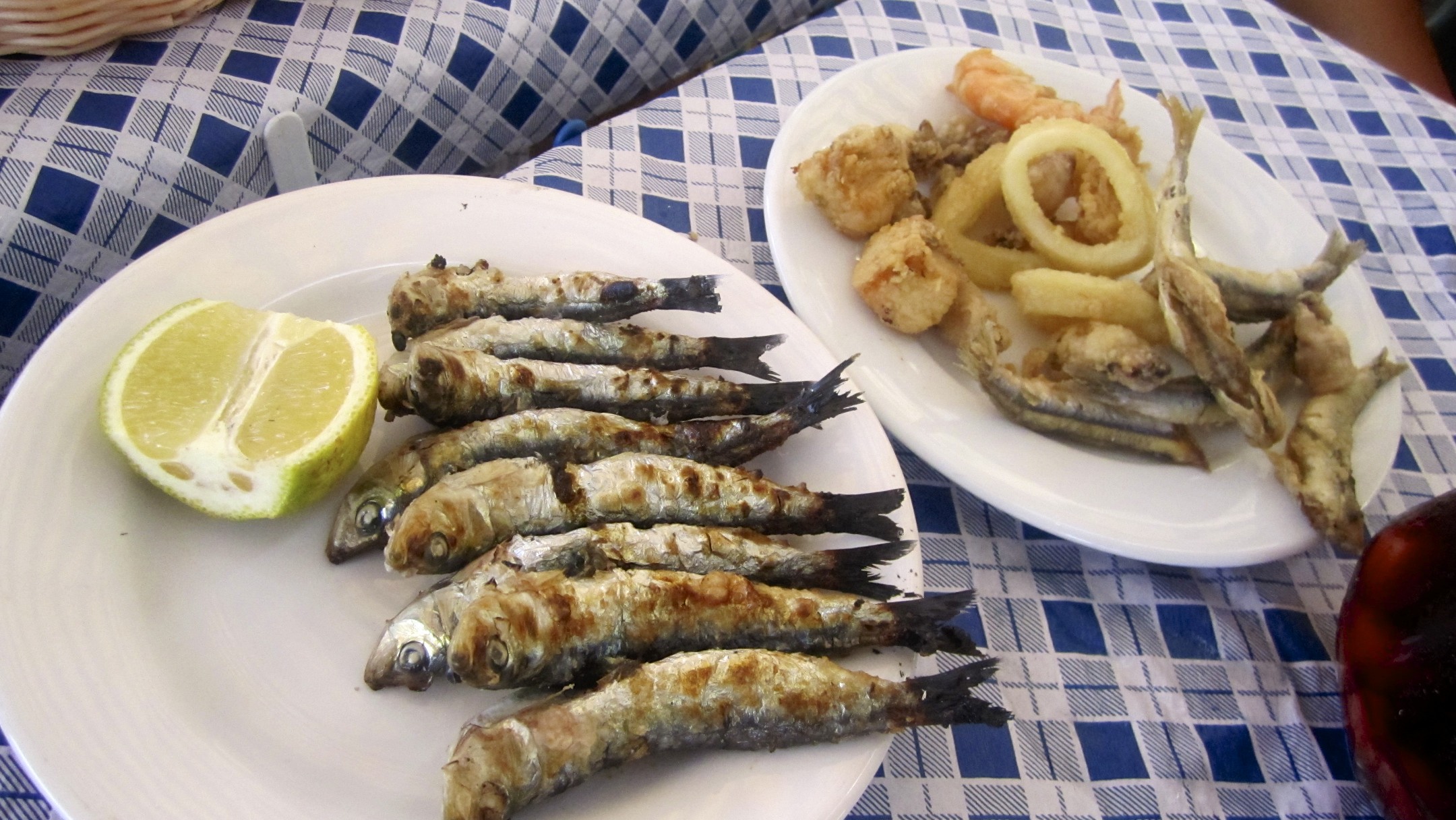 Our first stop was a small restaurant on the beach. I left it up to the Spaniard in the group to order something tasty for me. We ended up all sharing a few things. The highlight of the meal for me was sangria, but I also had some tasty fried calamari, tortilla de patata, and for the first time ever, tried fried sardines. They were surprisingly good! We also were able to watch them be cooked, right on the beach.