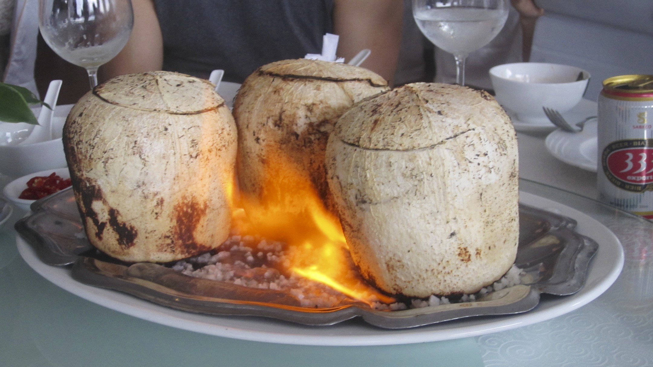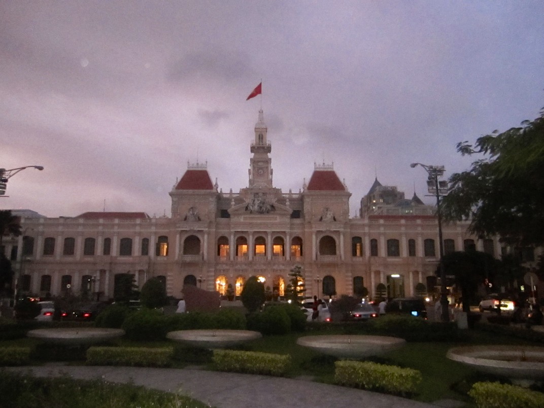 By the time we got to lunch, it was nearly 4:00pm. We were starving! Luckily, there was a wonderful meal in store for us. We ate at the top floor of The Grand Hotel. We had seafood soup, fried vegetables, steamed fish, lychee salad, rice, and best of all, coconut beef. The beef came out inside coconut shells, and after the waiters set down the trays, they lit them on fire. It was such a spectacle! Dessert consisted of some delicious fresh fruit, and some of the best coffee I’ve had in months. If you have a chance to drink Vietnamese coffee, do it!